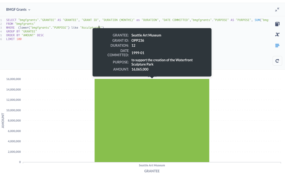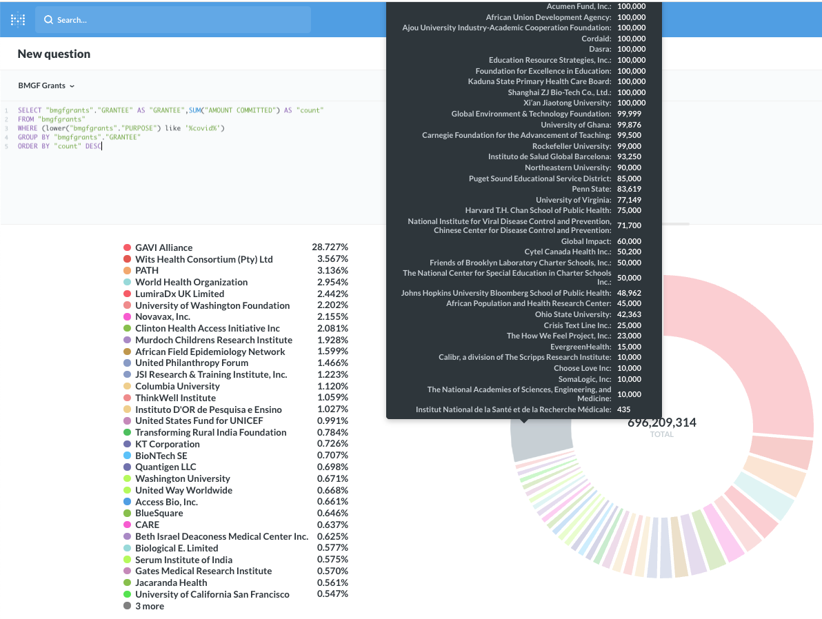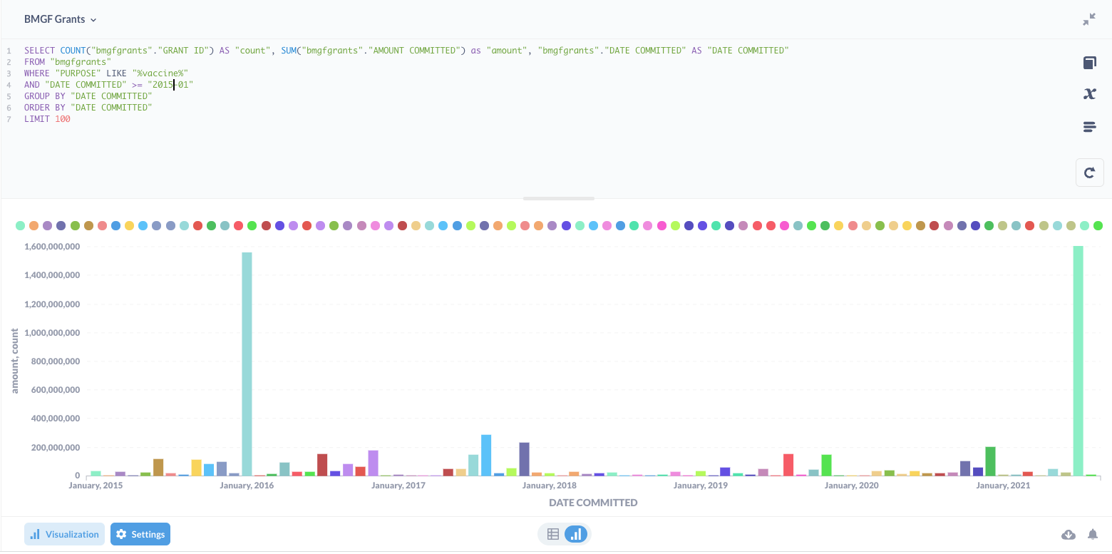 - In the metabase folder run docker-compose up and after some time open localhost:3000 login go to admin and add the sqlite database at /metabase-data/bmfgrants.db