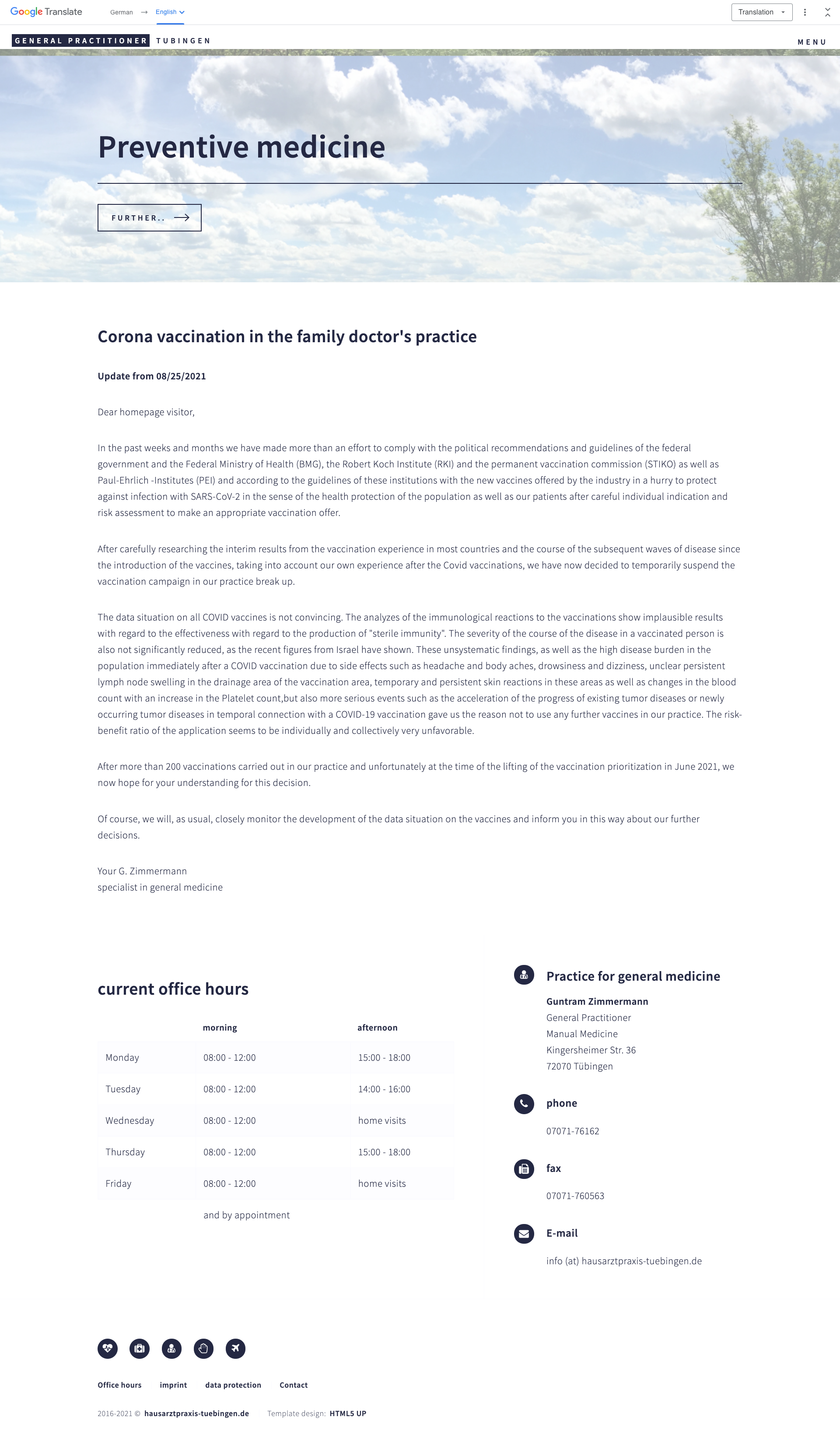 After more than 200 vaccinations carried out in our practice and unfortunately at the time of the lifting of the vaccination prioritization in June 2021, we now hope for your understanding for this decision.