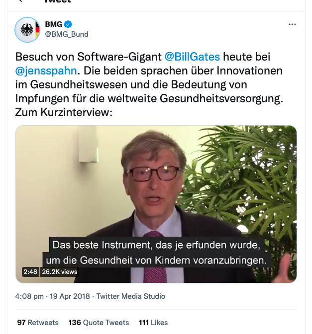 Besuch von Software-Gigant @BillGates heute bei @jensspahn. Die beiden sprachen über Innovationen im Gesundheitswesen und die Bedeutung von Impfungen für die weltweite Gesundheitsversorgung. Zum Kurzinterview: pic.twitter.com/xjyzKVjnOQ