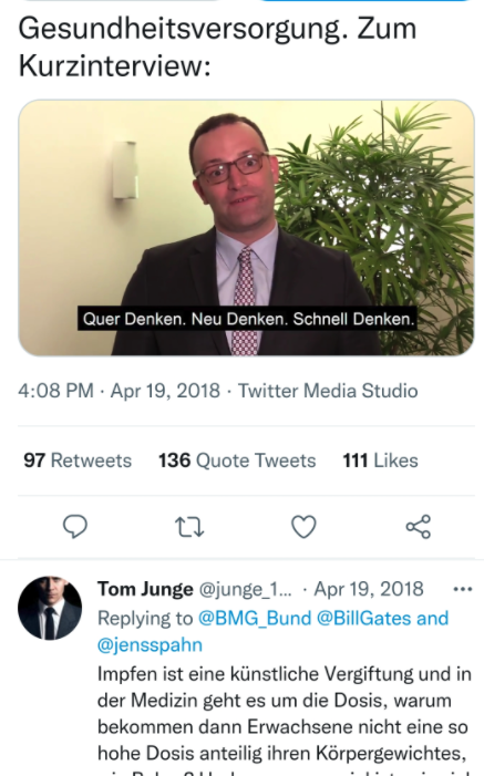 Dr Hofmeister, Head of of the Association of Statutory Health Insurance Physicians "KBV" says to "end the horror restrictions and panic propaganda of the pandemic" but head monkey and potential future "Merkel" replacement "Mr(s) Spahn" says "nah, screw your science there is too much money to be made"