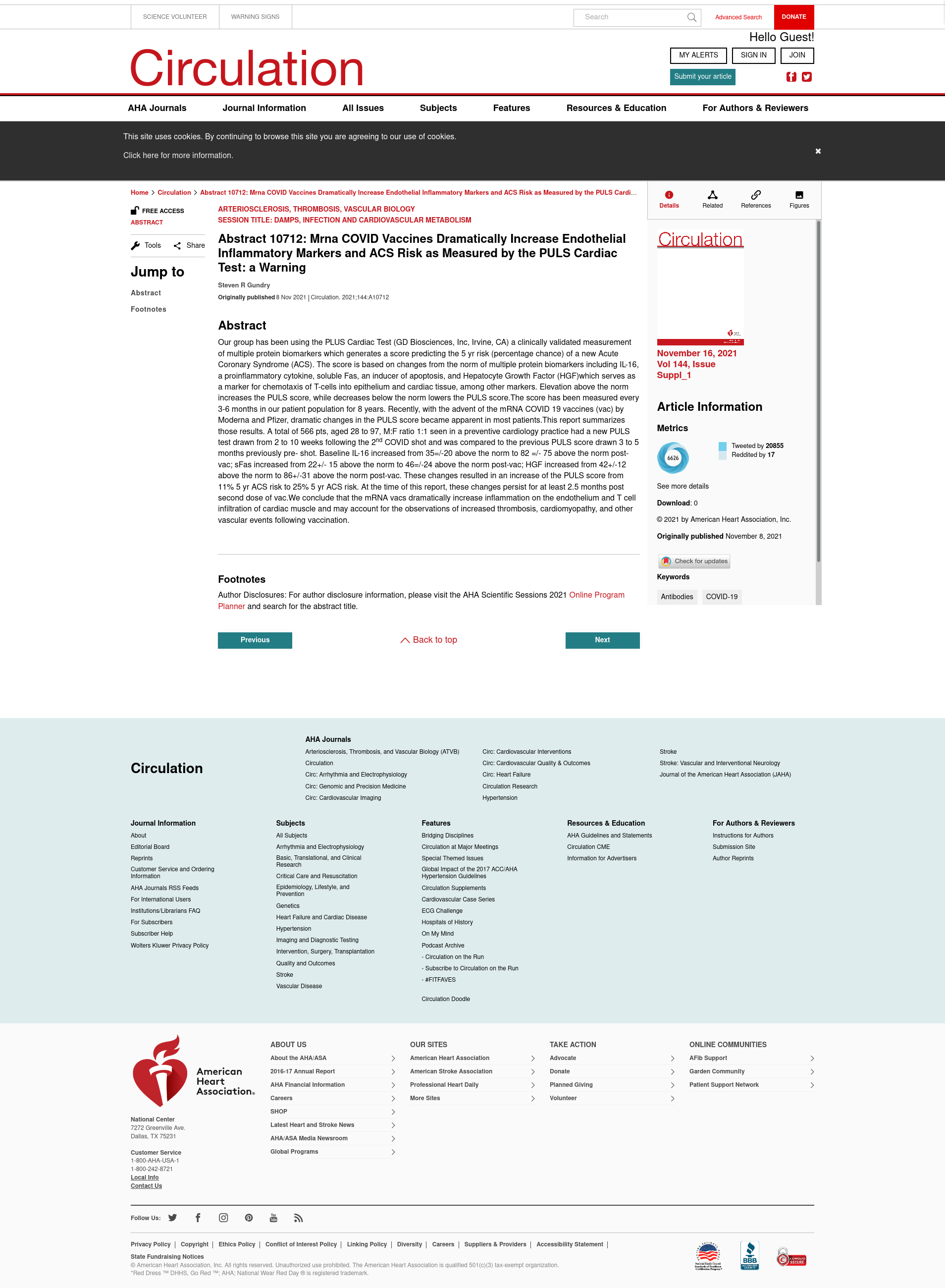 Pfizer and Moderna mRNA COVID-19 vaccines "dramatically increase endothelial inflammatory markers and Acute Coronary Syndrome (ACS) risk" as measured by the PULS cardiac test, a study recently published in "Circulation," the most prestigious cardiology journal, finds.