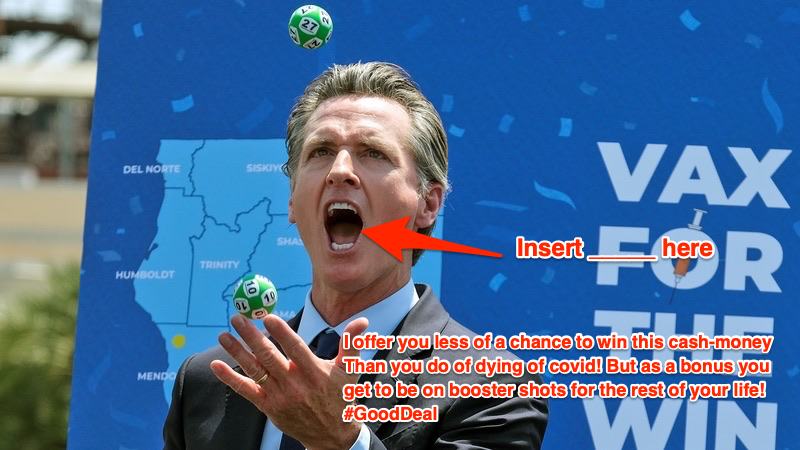 California, is made of money, therefor appealing to the poor via a 1-chance-in-20M to win some cash (which you will have to use to pay for your hospitalisation bills afterwards) is regarded as an economic stimulus package by some and a cheap low-class incentive from one of the most vapid people in government. But they wont do anything about the human shit on the way to pick up your pumpkin spice latte.. so fuck you.