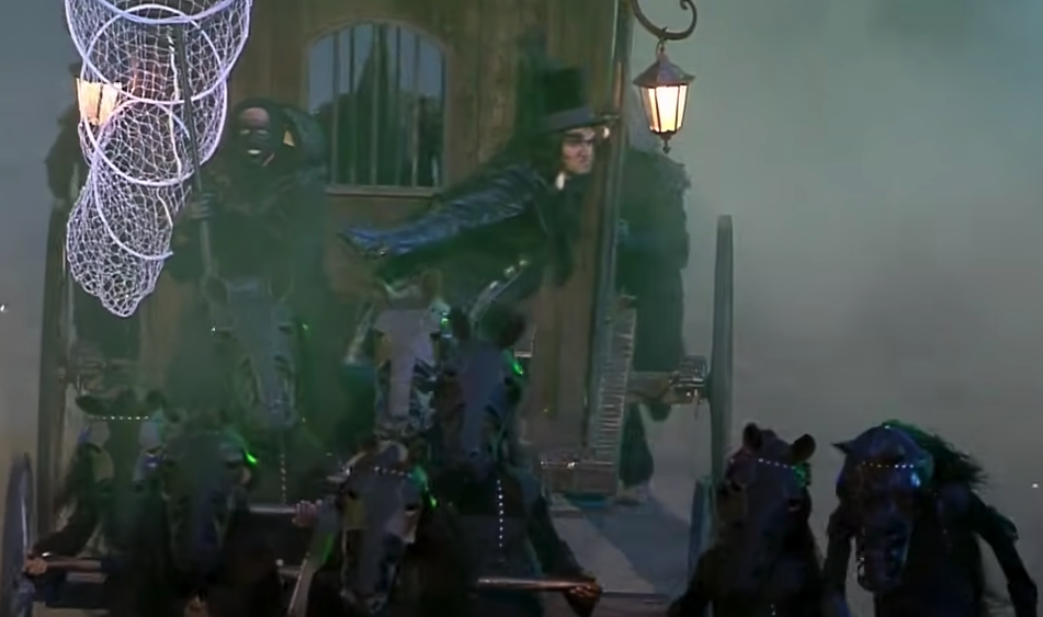 A black stagecoach with a net drawn by daemonic horses and a daemon driver... competing in shotput I guess?